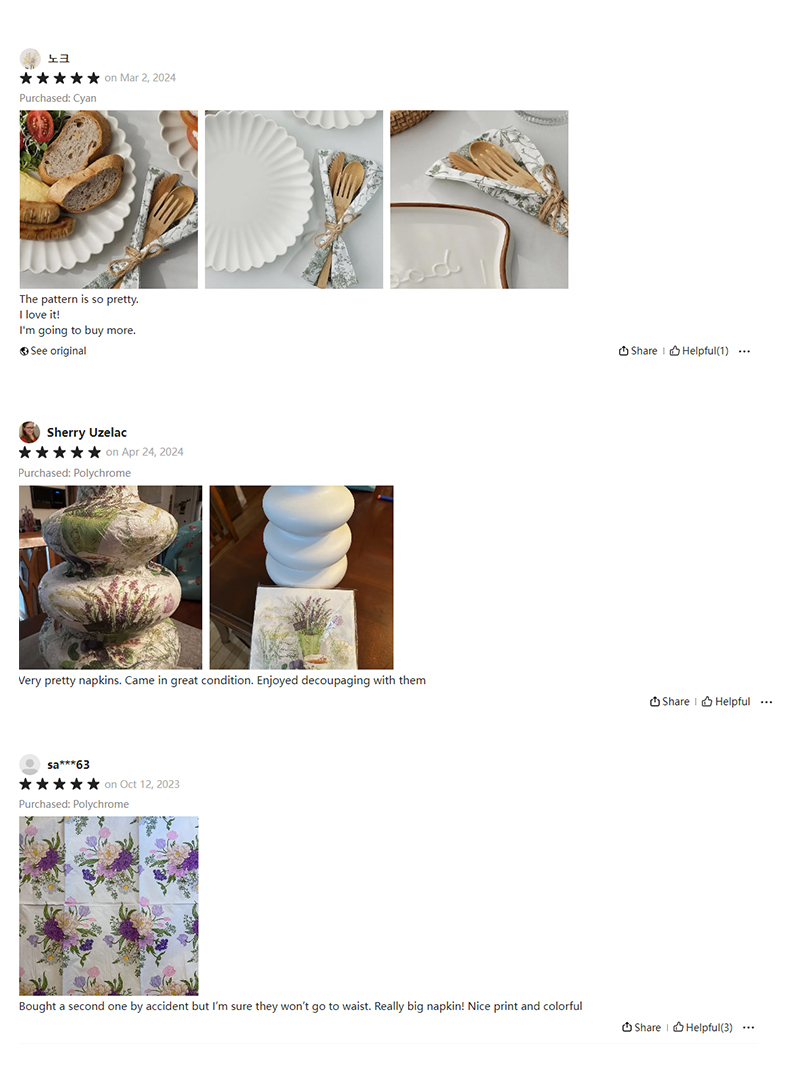 Sehen Sie, was unsere zufriedenen Kunden über die von uns hergestellten Servietten sagen! Nehmen Sie sich einen Moment Zeit, einige unserer 5-Sterne-Bewertungen zu lesen und werden Sie noch heute einer unserer zufriedenen Kunden!