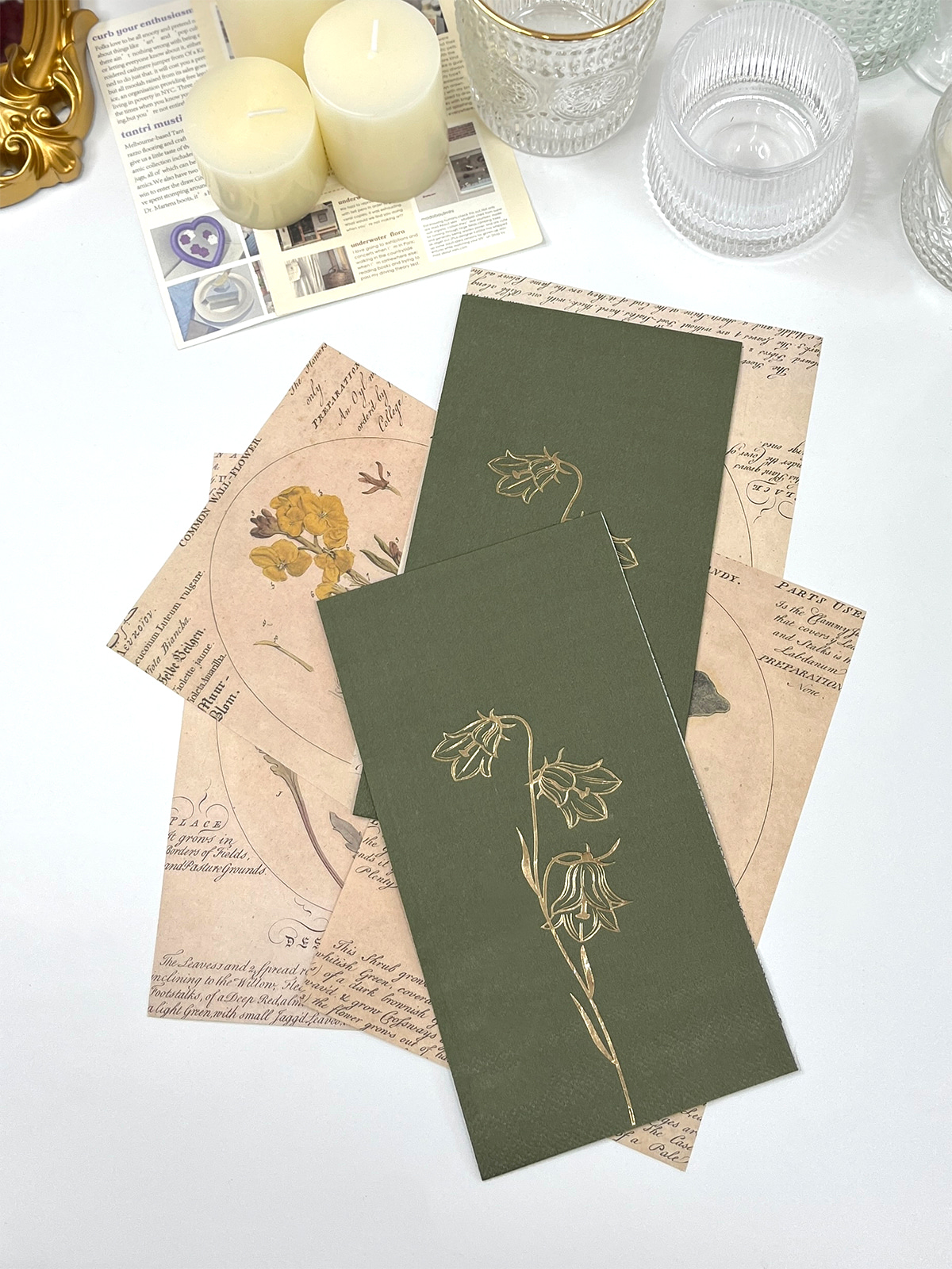 Die Gästeservietten mit Maiglöckchen-Motiv aus Goldfolie zeichnen sich durch aufwendige Blumenmuster auf grünem und dunkelgrünem Hintergrund aus. Sie sind attraktive und elegante Partydekorationen, geeignet für Hochzeiten, Abendessen, Badezimmer und mehr.
